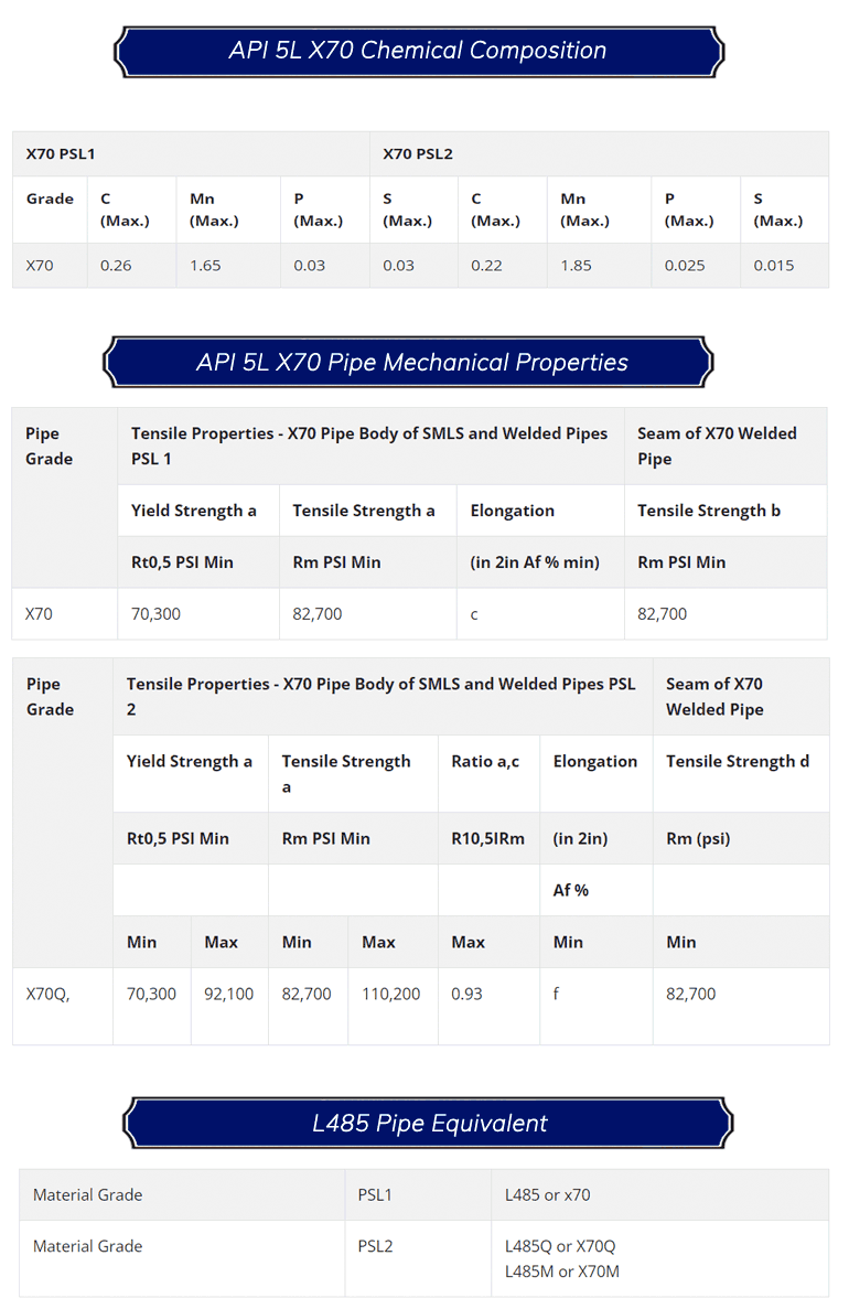 API 5L X70 Pipe specification, chemical composition, mechanical properties and equivalent